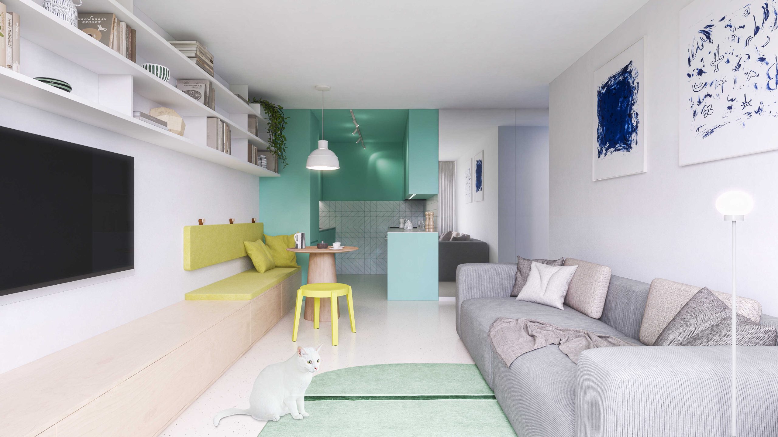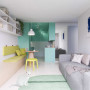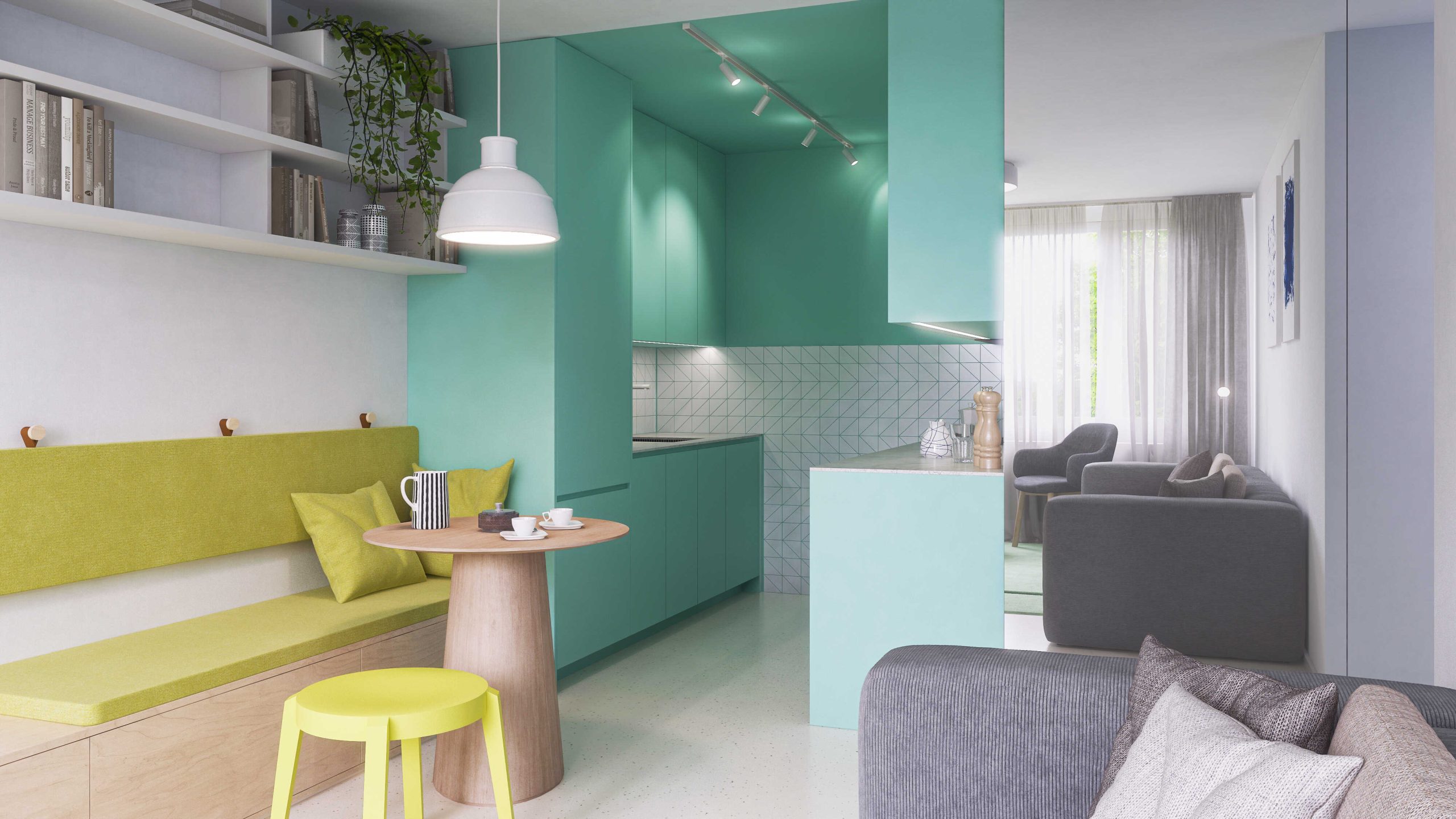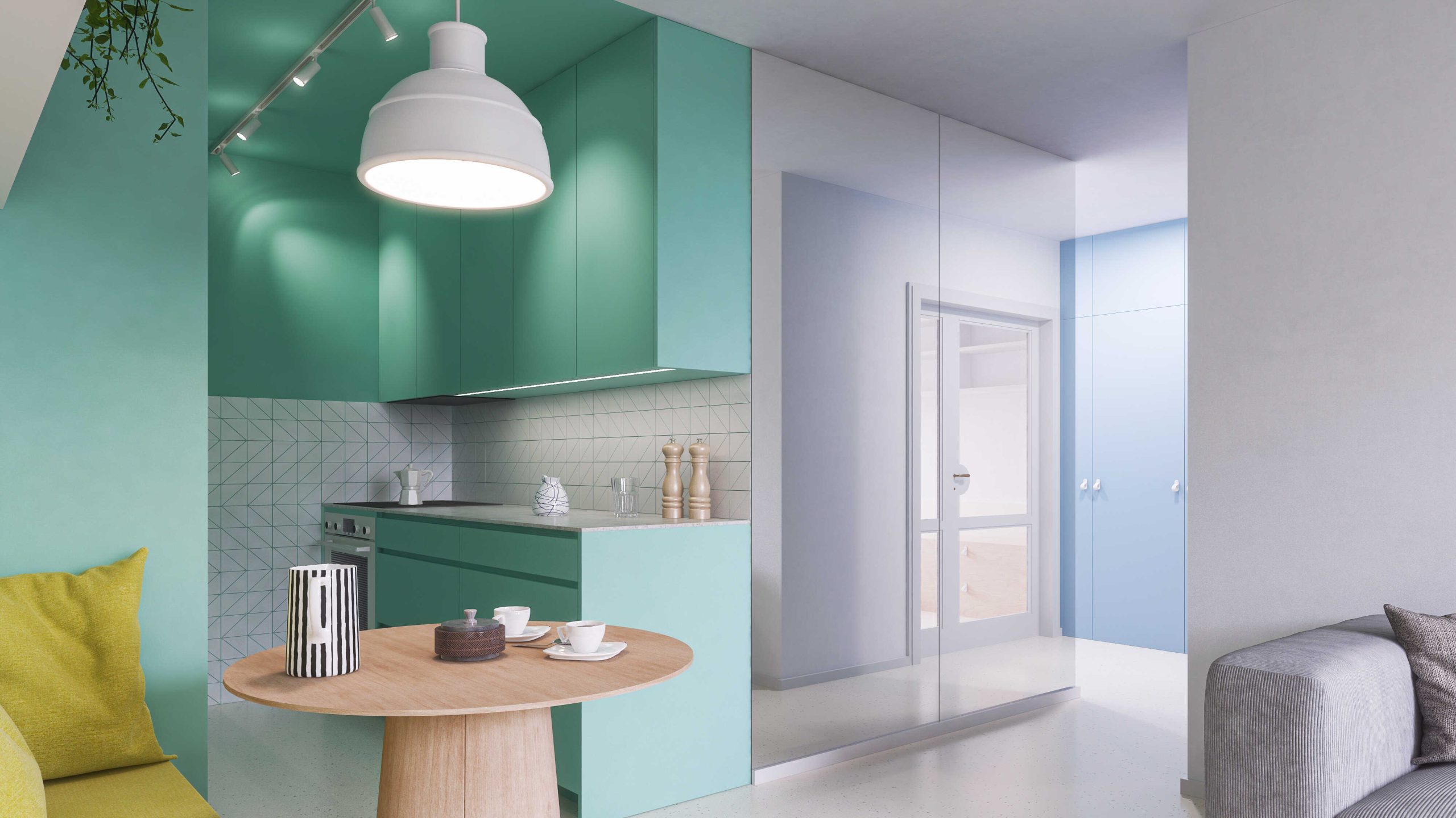 Přo oživení a zároveň vymezení prostoru pracuji z barvnými bloky v pastelových odstínech - mátová v kuchyni a šedomodrá v předsíni.